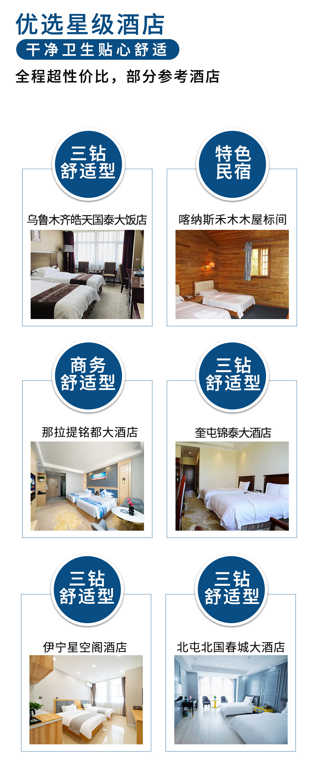 舒適住宿:全程60%以上攜程4.0分以上3鉆酒店
